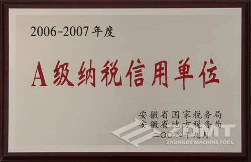 近日,安徽省國家稅務(wù)局、地方稅務(wù)局聯(lián)合表彰了2006-2007年度納稅信用等級A級納稅人,中德機床也再次被授予了“A級納稅信用單位”的證書。