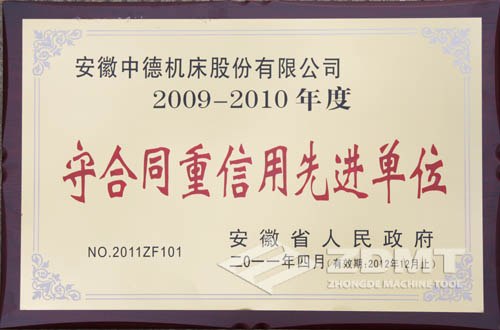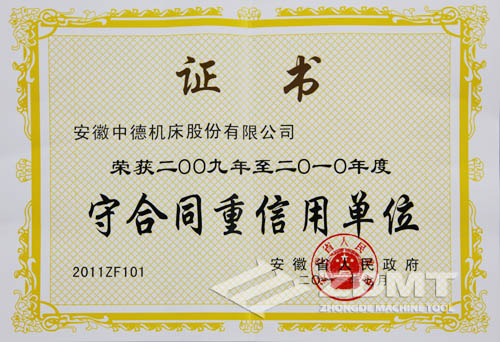 這也是我公司第三次獲得省政府授予的“守合同重信用先進單位”稱號,公司不斷發揚“守合同、重信用”的良好傳統,不斷探索、潛心經營,逐漸建立、健全了一套適合市場規律和行業、企業自身特點的合同管理機制,強化了合同的管理,確保了合同的履行,呈現出合格率100%,優良率85%以上,履約率達100%的喜人景象,取得經濟效益和社會效益的雙豐收,贏得了社會各界的廣泛認可,增強了社會大眾對“中德機床”品牌的認知度,加速了品牌傳播、提升了品牌知名度,樹立了中德機床公司良好的社會形象。